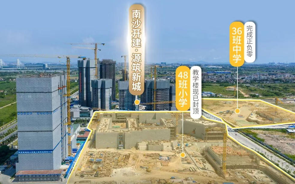 源筑新城家门口的“广州大学附属中学南沙实验学校(暂定)”,也将是如此。享受广大附中集团办学理念、办学管理、师资建设、课程发展、教学教研等全方位支持。这里将打造48班小学、36班中学,提供约3960个学位,覆盖九年义务教育阶段,更好满足小学与初中的教育需求。目前,小学教学楼部分已封顶,预计2026年竣工,中学已完成正负零,预计2027年竣工建成。
